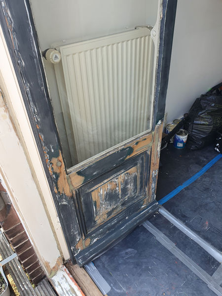 Na het schilderwerk van de Kivietstraat aan de overkant gedaan te hebben, wouden de overburen ook graag de voorgevel geschilderd hebben. Ook hier was het schilderwerk niet in een goede staat. Het portiek plafond is nog van oudsher gestukt op riet. Ik heb het plafond verwijderd en meteen geïsoleerd. Ook de muren waren er slecht aan toe door optrekkend vocht. De heb ik gerepareerd met een ademende mortel. Her en der wat houtrot hersteld. Wederom weer een dankbare klus!
